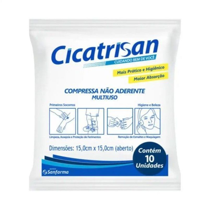 A compressa não aderente CICATRISAN é ideal para cobertura de ferimentos, cortes e arranhões. Sua estrutura porosa e não-aderente ao ferimento, facilita a remoção do curativo e tem absorção 10 vezes maior que uma compressa de gaze (100% algodão). É indicada para primeiros socorros, limpeza, assepsia e proteção de ferimentos.